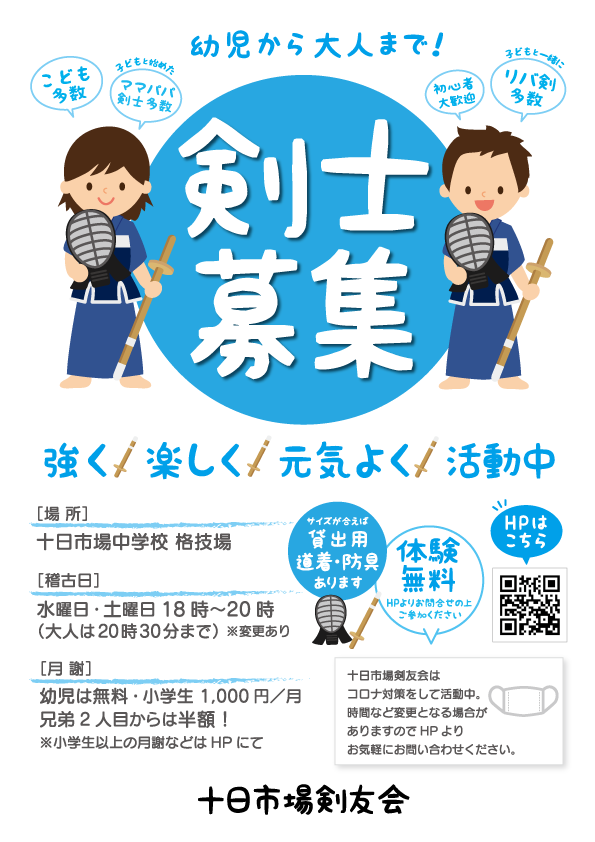 十日市場剣友会には幼稚園児の初心者からママさん剣士、大人初心者やリバ剣まで様々な年齢の人が稽古に励んでいます。
